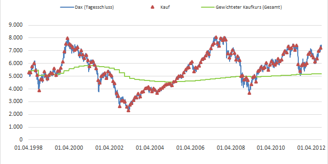 Ich halte für daher erst einmal fest, dass ein Kurs des DAX von ungefähr 14.000 Punkte am 31.03.2018 mich sicher an die Rendite von rund 7,5% heranführen würde, die ein Sparplan auf den DAX bei 6% Rendite und diesen Kursbewegungen erreichen sollte. Dafür hat er eben noch 5,5 Jahre Zeit. Aber er ist auf dem richtigen Weg und es gibt immer noch kein anderes Investment, welches mit 100 € pro Monat auch nur annähernd den gleichen Sinn ergeben würde, wie ein Sparplan auf einen Index. Insofern hoffe ich einfach auf weiter steigende Kurse, und wenn die 14.000 Punkte eben etwas später erreicht werden, ist die Rendite eben geringer. Ich muss zu keinem bestimmten Tag verkaufen und das solltest Du bei Aktieninvestments auch nicht müssen, sonst ist es Spekulation, nicht Investition.