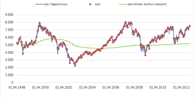 Das lohnt sich durchaus am eigenen Leib zu testen und ich kann es bestätigen. Gefühlt geht es immer hoch und runter und ich bin überrascht, wenn es irgendwann wieder ein neues Hoch gibt. Dies hängt dann zwar mit einer Phase nur steigender Kurse zusammen und die Phase davor, in der es nur tiefer und tiefer ging, liegt schon länger in der Vergangenheit. Aber dennoch erinnert sich eben jeder an den letzten Crash, oder sogar den vorletzten, aber stetige Kurssteigerungen von wenigen Prozenten werden dadurch leicht übersehen.